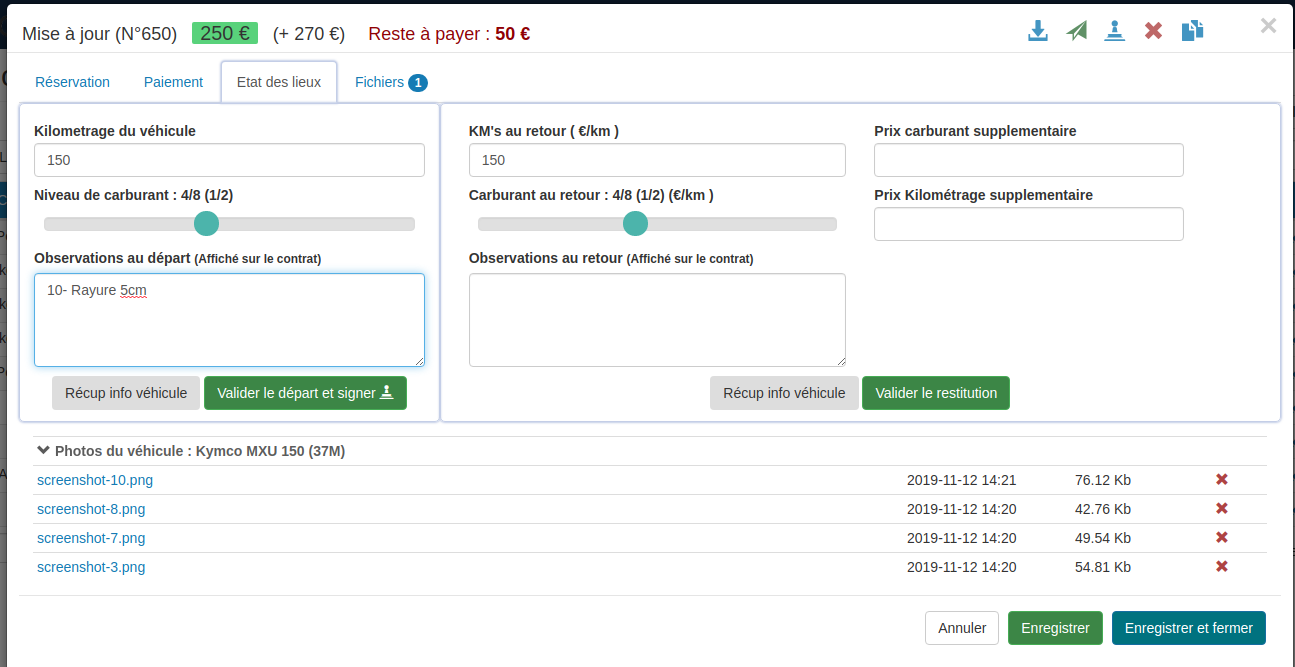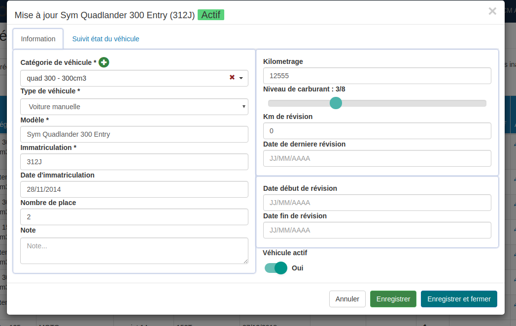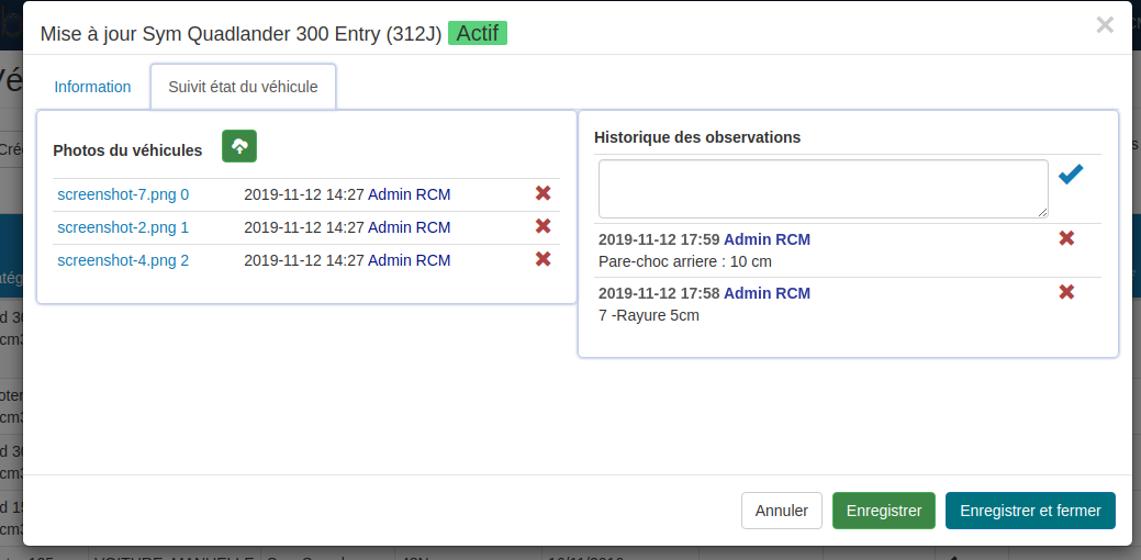 Gestion de tout type de véhicule, Kilomètres, historique d'observations, photo du véhicules...